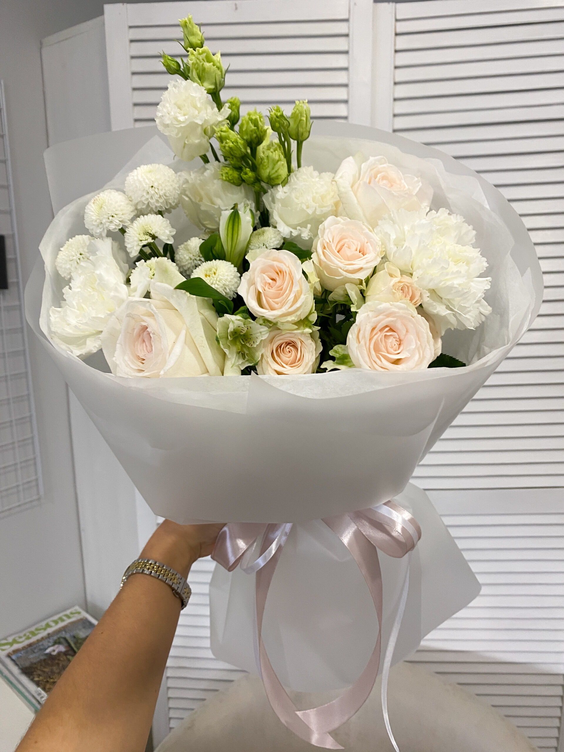 | Цветы | альстромерия, гвоздика, кустовая роза, пионовидные розы, хризантема, эвкалипт, эустома |