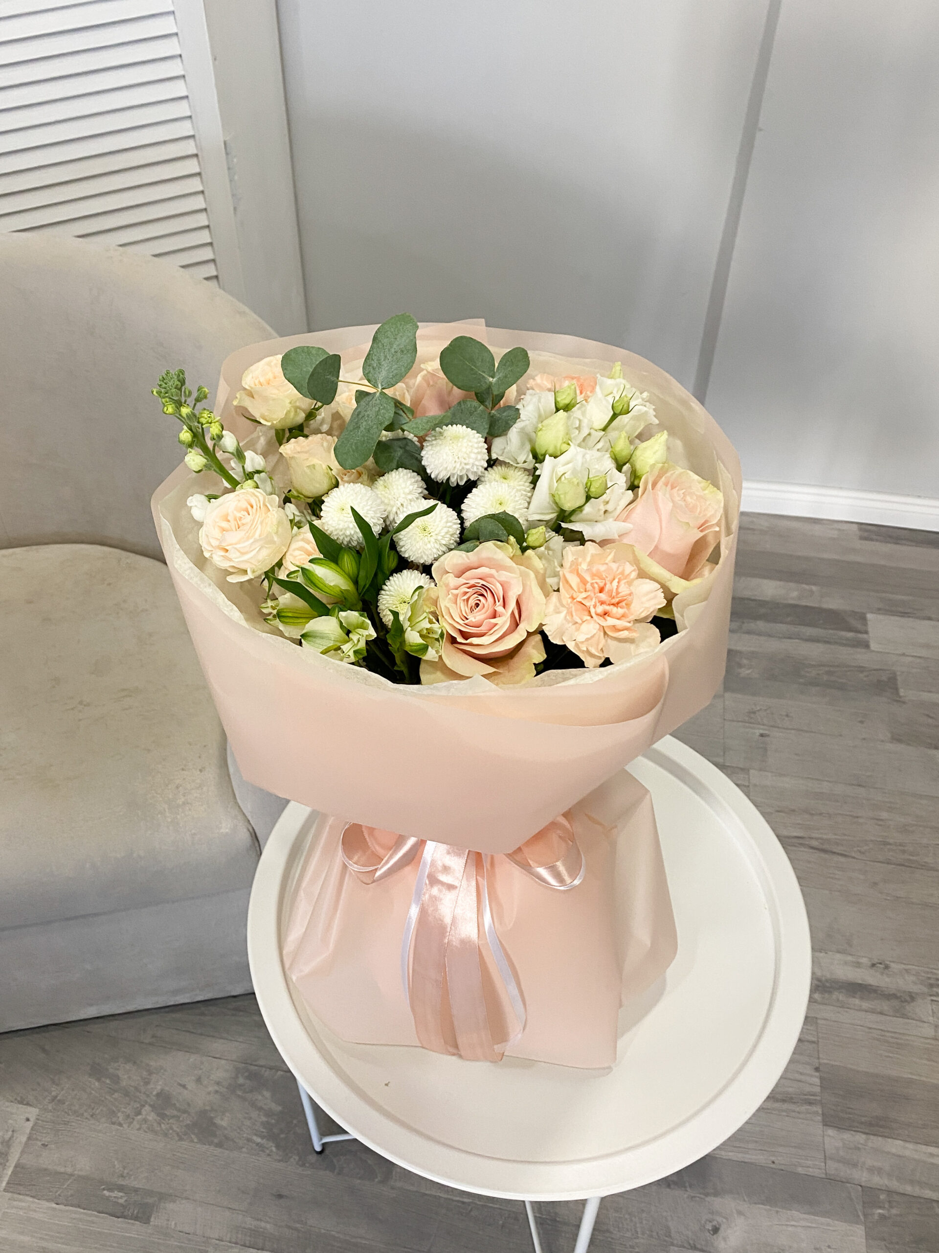 альстромерия, гвоздика, маттиола, роза, хризантема, эвкалипт, эустома