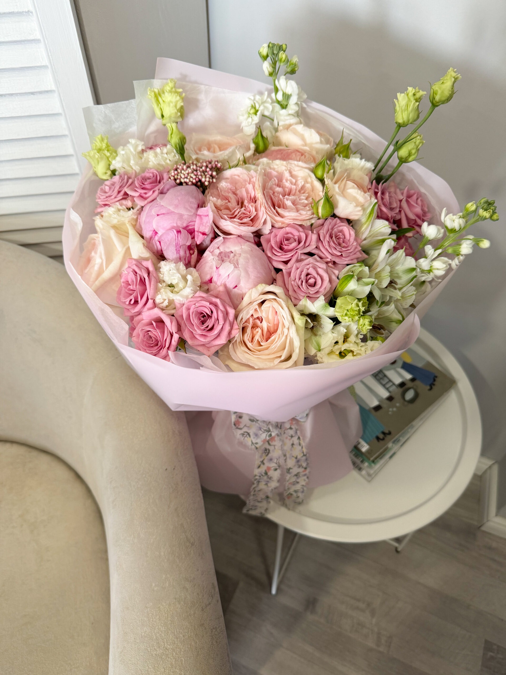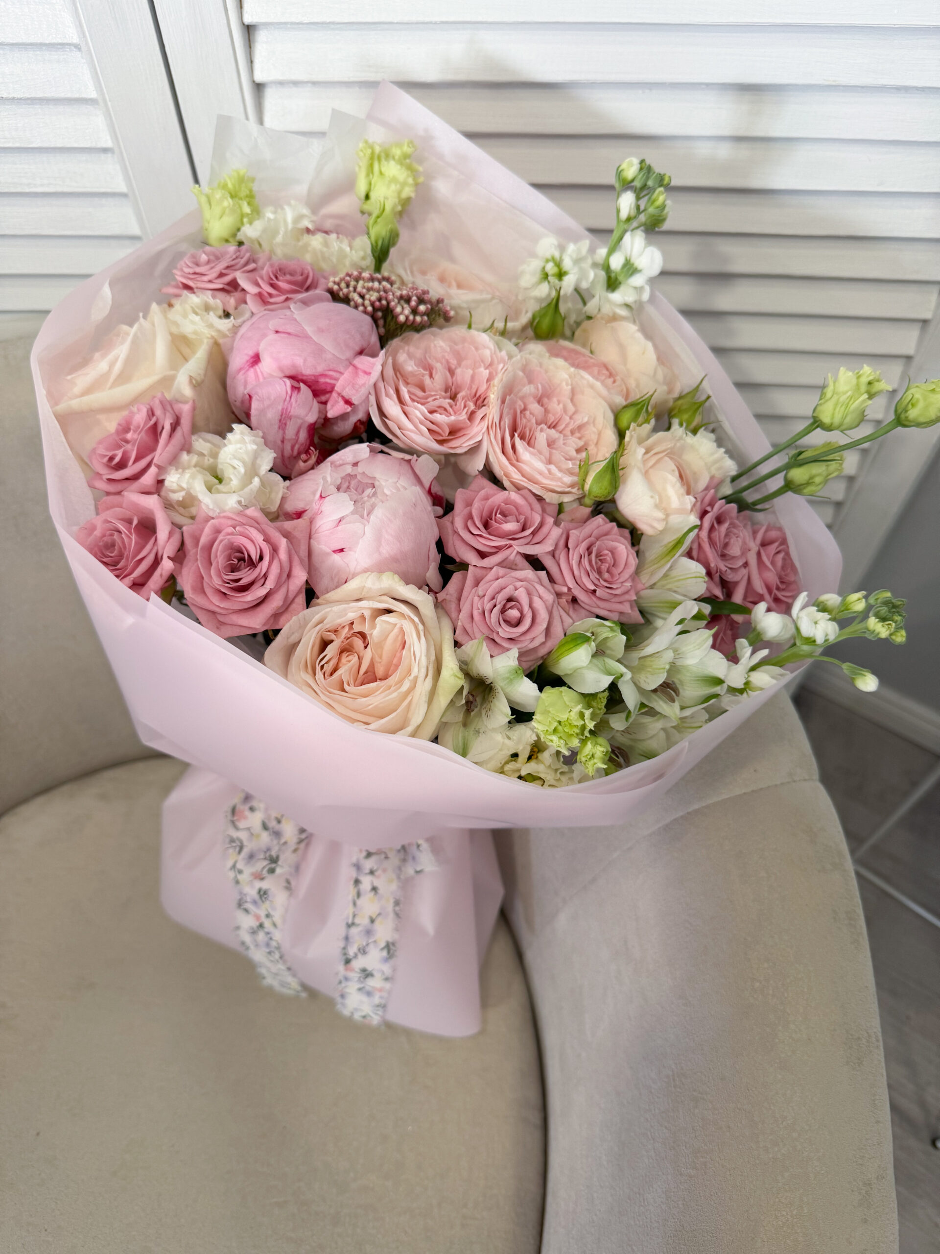 Букет из пионов, пионовидных роз, эустомы, маттиолы, озатамнуса и альстрамерии