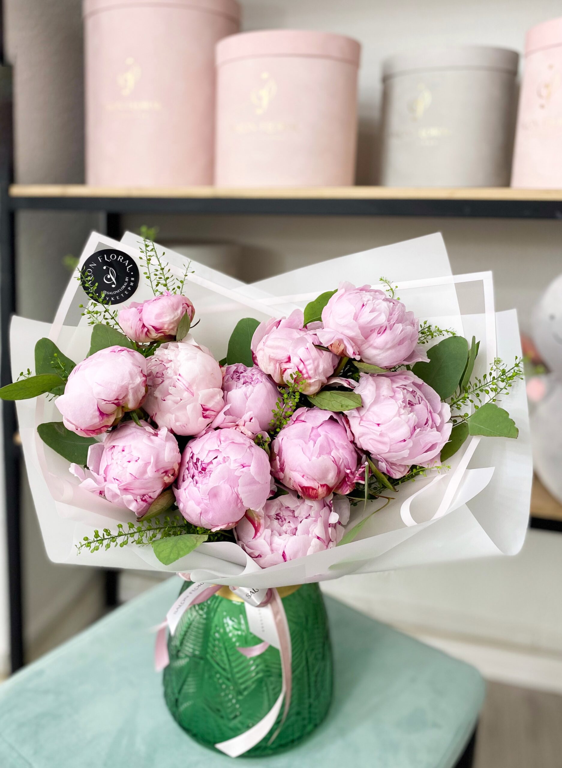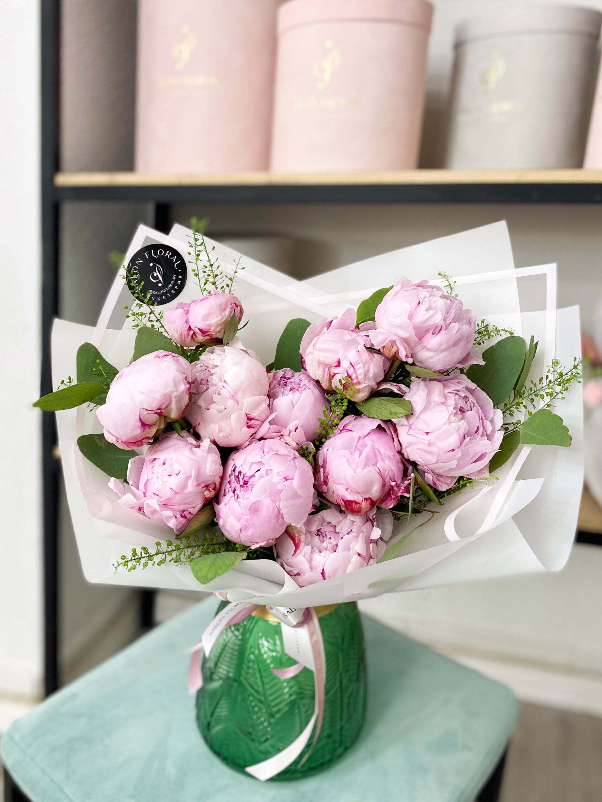 Букет из 11 пионов и эвкалипта